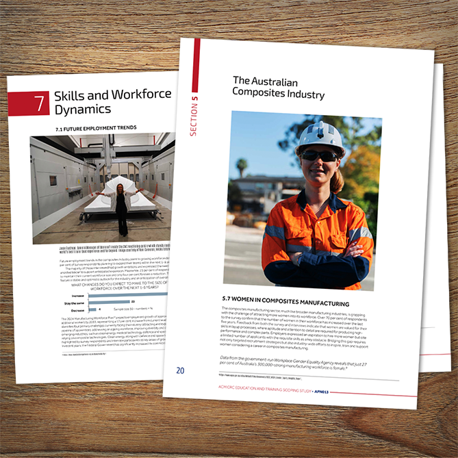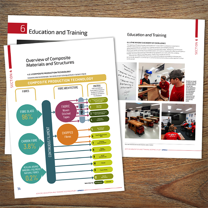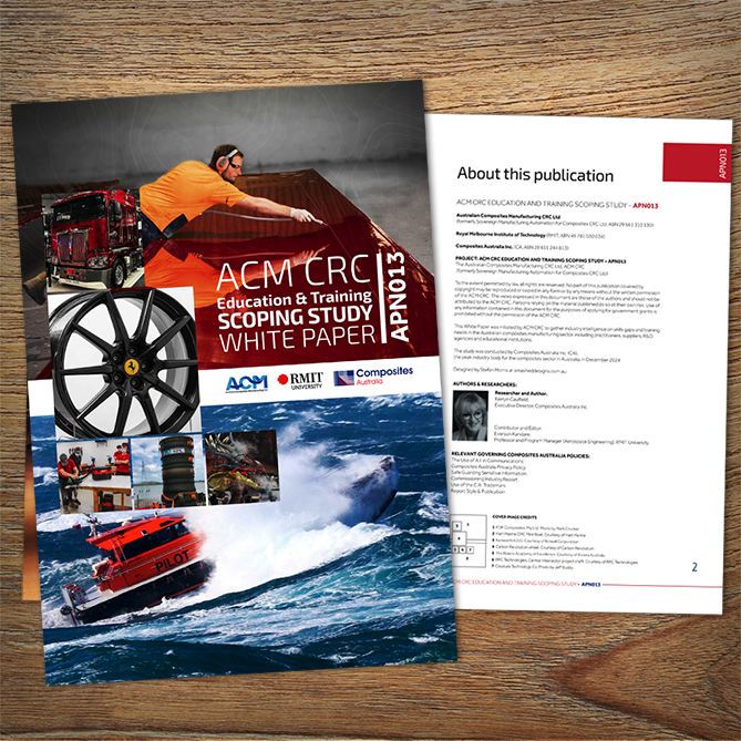 Design and editing/proofreading of an 80-page white paper commissioned by ACM CRC, RMIT and Composites Australia Inc. to gather industry intelligence on skills gaps and training needs in the Australian composites manufacturing sector, including practitioners, suppliers, R&D agencies and educational institutions.